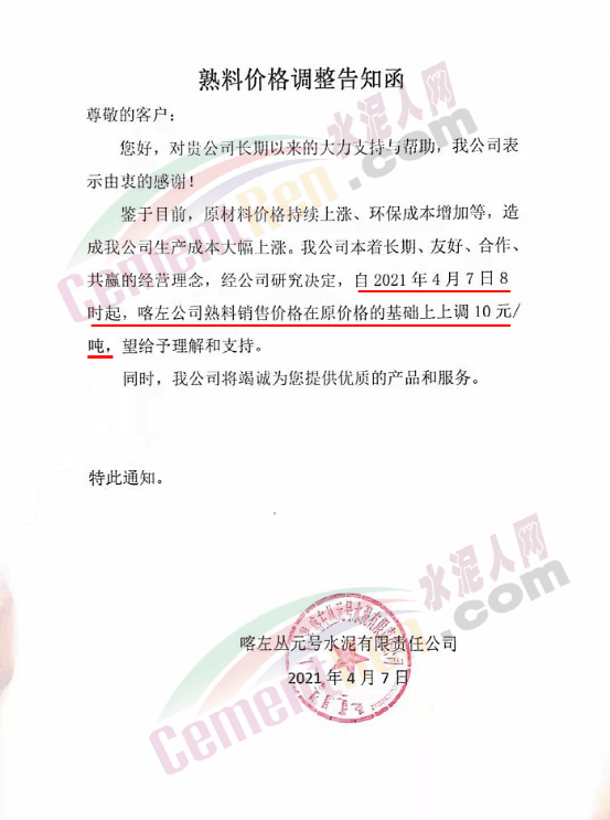 遼寧喀左叢元號(hào)水泥熟料價(jià)格調(diào)整告知函稱,鑒于目前,原材料價(jià)格持續(xù)上漲、環(huán)保成本增加等,造成公司生產(chǎn)成本大幅上漲。自4月7日8時(shí)起,喀左公司熟料銷售價(jià)格在原價(jià)格的基礎(chǔ)上上調(diào)10 元/噸。