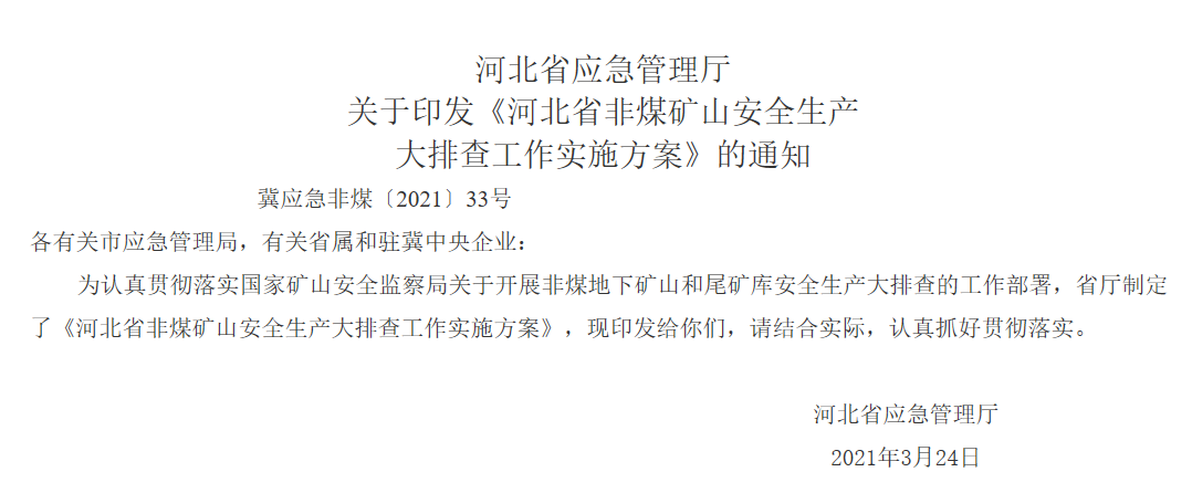 特別是要聚焦當前突出問題和重點工作,按照《河北省應(yīng)急管理廳關(guān)于貫徹落實全國礦山安全生產(chǎn)視頻會議精神進一步加強當前非煤礦山安全生產(chǎn)工作的緊急通知》(冀應(yīng)急非煤〔2021〕20號)要求,