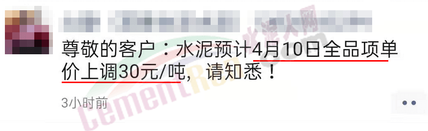 另一家企業(yè)通知,因混凝土原材料不斷上漲,尤其水泥上漲了100元/噸,此舉造成混凝土成本大幅攀升。經(jīng)公司研究決定對混凝土售價進(jìn)行調(diào)整?;炷羶r格在現(xiàn)行結(jié)算價格上上調(diào)80元/立方。起調(diào)日期為4月12日0時。
