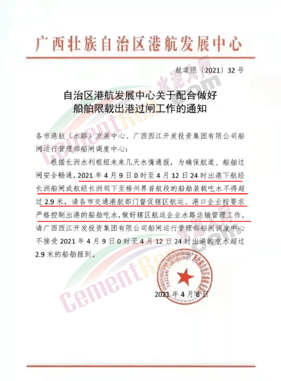 據(jù)水泥人網(wǎng)了解,4月8日廣西壯族自治區(qū)港航發(fā)展中心發(fā)布《自治區(qū)港航發(fā)展中心關(guān)于配合做好船舶限載出港過閘工作的通知》給各市港航(水路)發(fā)展中心、廣西西江開發(fā)投資集團(tuán)有限公司船閘運(yùn)行管理部船閘調(diào)度中心稱: