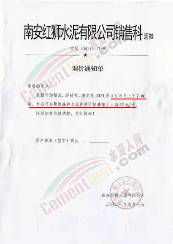 南安紅獅銷售科通知,自4月8日上午7時起,各規(guī)格品種水泥價格上調(diào)55元/噸。