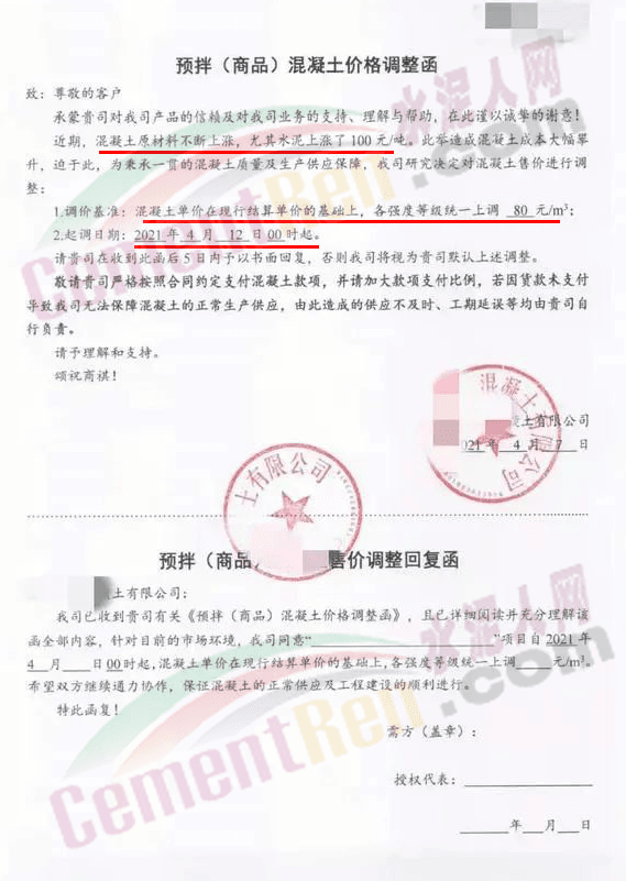 其中一家企業(yè)通知稱隨著今年水泥單價上漲了100元/噸,石子上漲了5 元-10元/噸,油價上漲了1-2元/升,其他原材料價格也有不同程度上漲,公司經(jīng)營處于虧損狀態(tài)。鑒于上述原因,為了滿足客戶的建設(shè)工程混凝土質(zhì)量及正常供應(yīng)需求。公司迫于成本和資金壓力擬將商品混凝土的價格進(jìn)行調(diào)整。雙方本著友好合作的基本原則,共同克服困難、共演難關(guān)。經(jīng)公司慎重研究決定,自 2021年4月 12 日 0時起針對混凝土單價進(jìn)行調(diào)整∶
