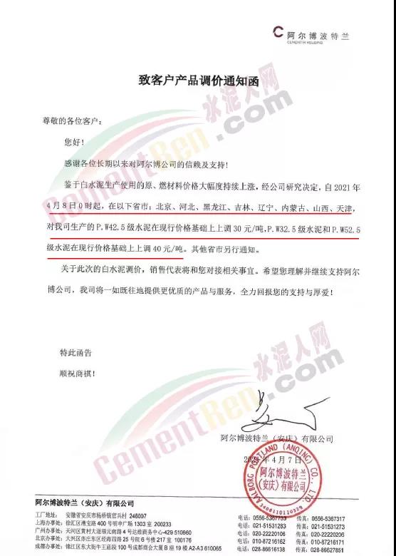 阿爾博波特蘭(安慶)公司通知鑒于自水泥生產(chǎn)使用的原、燃材料價格大幅度持續(xù)上漲,經(jīng)公司研究決定,自4月8日0時起,在北京、河北、黑龍江、吉林、遼寧、內(nèi)蒙古、山西、天津,對公司生產(chǎn)的P.W42.5級水泥在現(xiàn)行價格基礎(chǔ)上上調(diào)30元/噸,P.W32.5 級水泥和P.W52.5級水泥在現(xiàn)行價格基礎(chǔ)上上調(diào) 40 元/噸。