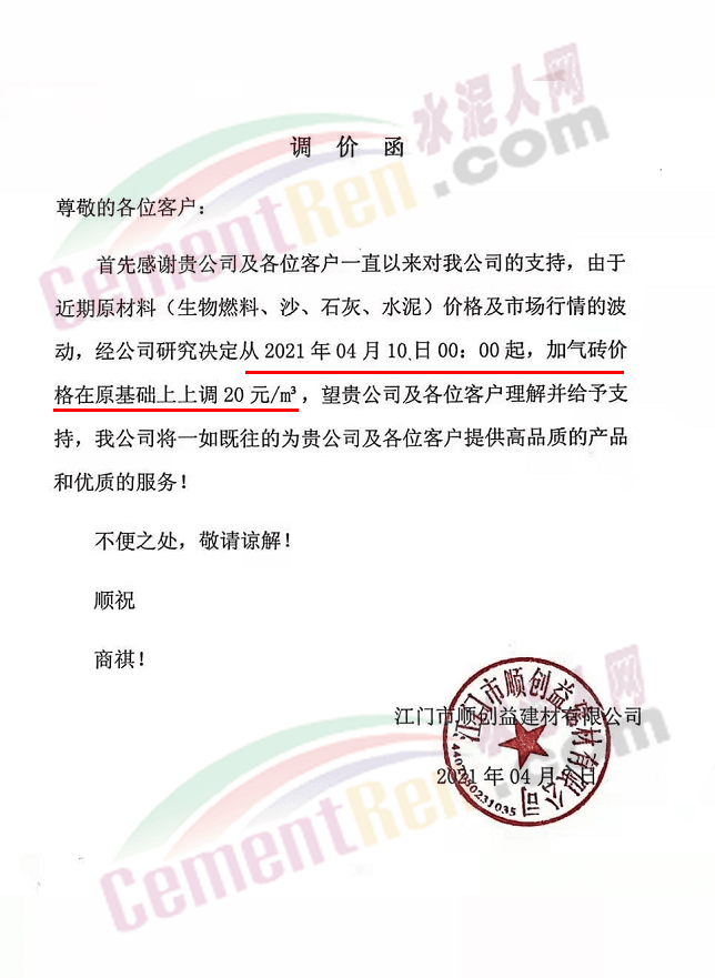 江門市順創(chuàng)益建材有限公司通知從4月10日零時起,加氣磚價格在原基礎(chǔ)上上調(diào)20元/立方。