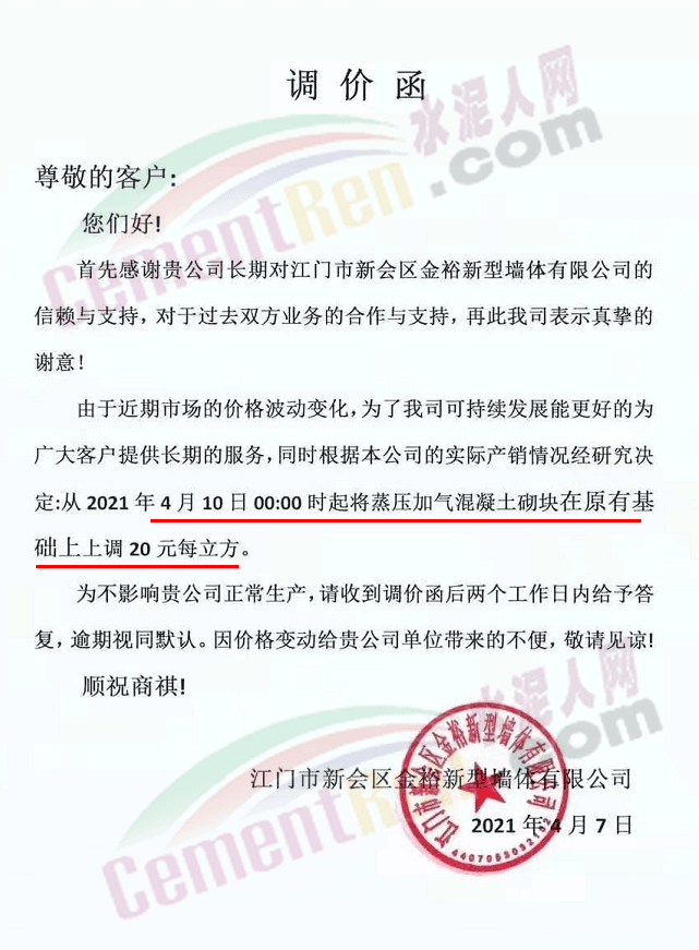 江門市新會區(qū)金裕新型墻體有限公司通知自4月10日零時起將蒸壓加氣混凝土砌塊在原有基礎(chǔ)上上調(diào)20元/立方。