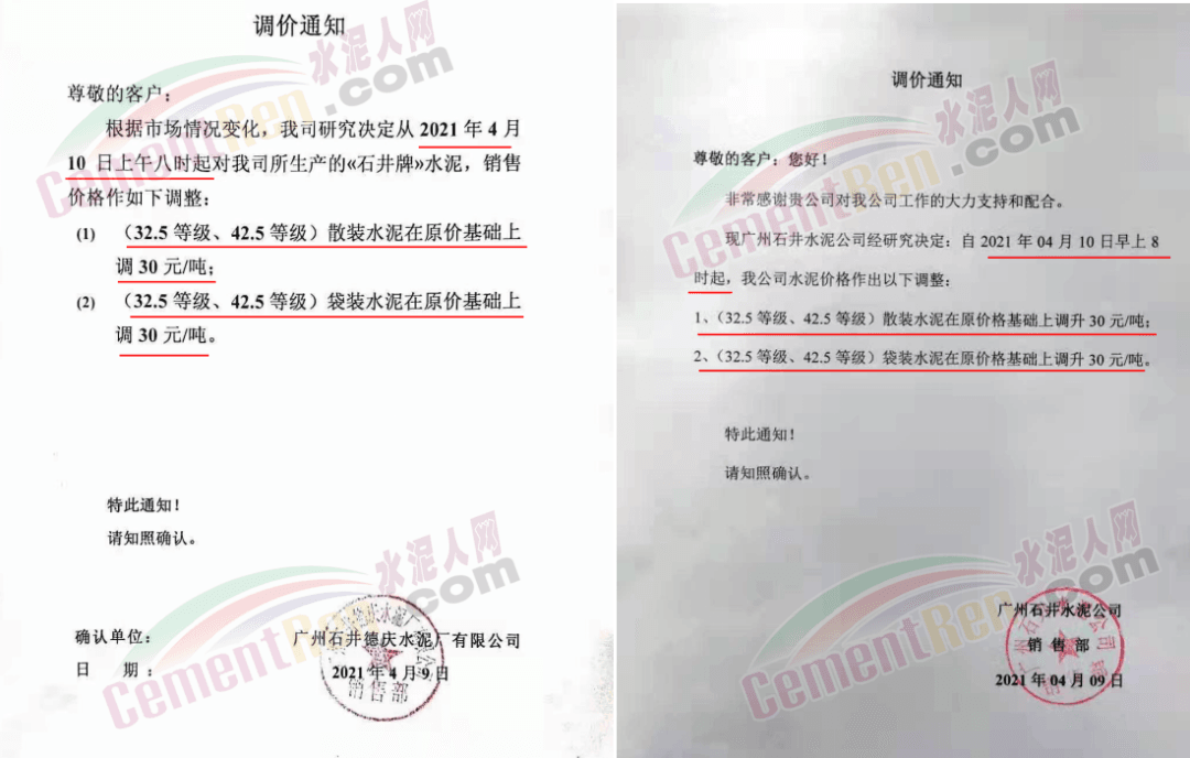 羅浮山水水泥集團(tuán)惠州國(guó)強(qiáng)水泥有限公司、博羅縣浮山水泥有限公司、惠州羅浮山旋窯水泥有限公司、惠州寶湖建材制造有限公司、惠州市惠陽雙新水泥有限公司等多家企業(yè)陸續(xù)通知上調(diào)各標(biāo)號(hào)水泥價(jià)格30元/噸。部分企業(yè)調(diào)價(jià)通知如下: