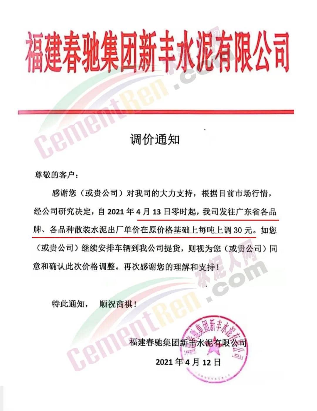 福建春馳集團(tuán)新豐水泥有限公司通知自4月13日零時起,發(fā)往廣東省各品牌、各品種散裝水泥出廠單價在原價格基礎(chǔ)上上調(diào)30元/噸。