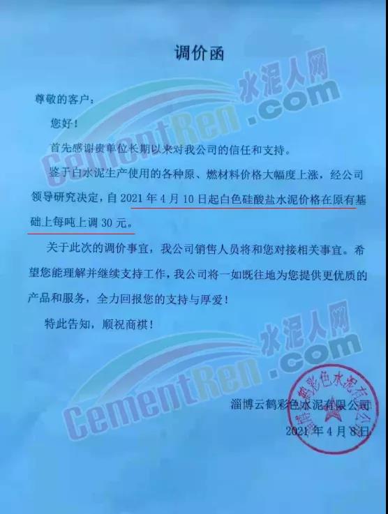 武漢市春森特種水泥有限公司通知,鑒于白水泥生產(chǎn)使用的原(燃)材料價格大幅度上漲等因素。經(jīng)公司研究決定,自4月12日8時起,公司生產(chǎn)的各種規(guī)格型號的白水泥在原價格的基礎(chǔ)上,均上調(diào)50元/噸。