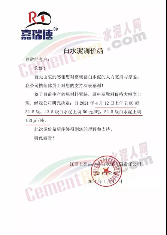 江西仙鶴白水泥有限責(zé)任公司通知鑒于白水泥生產(chǎn)使用的原(燃)材料價格大幅度上漲等因素。經(jīng)公司研究決定,自4月12日起,公司生產(chǎn)的各種等級的白水泥在原基礎(chǔ)上上調(diào)50元/噸。江西省內(nèi)各地區(qū)白水泥在原基礎(chǔ)上上調(diào) 80元/噸,熟料上調(diào)100元/噸。