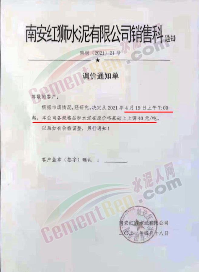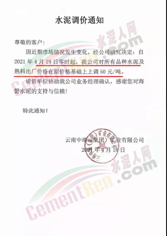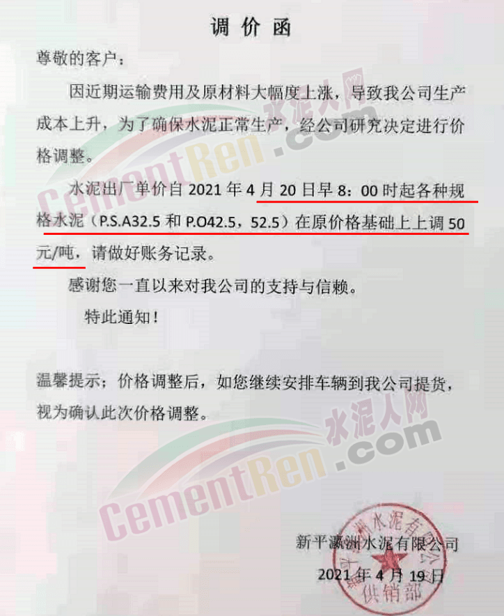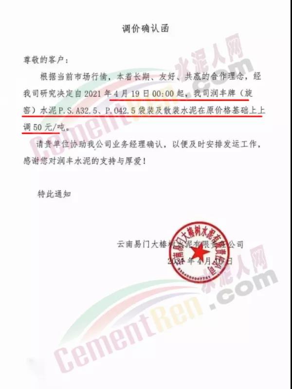 福建泊安建材通知,根據(jù)當(dāng)前水泥市場行情,各水泥企業(yè)相繼上調(diào)價格的背景下,公司已接廠家通知∶“跟隨其他水泥企業(yè)于2021年4月20日0時起,各品種各規(guī)格型號水泥,在原價格基礎(chǔ)上上調(diào)相應(yīng)價格!”