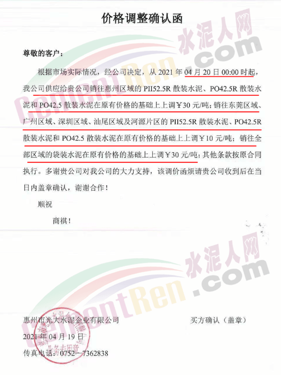 惠州光大水泥通知:從4月20日0時起: