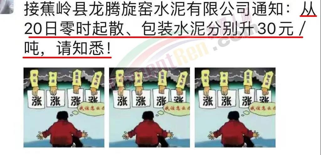 蕉嶺縣龍騰旋窯水泥有限公司通知∶20日零時起散、包裝水泥分別上調(diào)30元/噸。