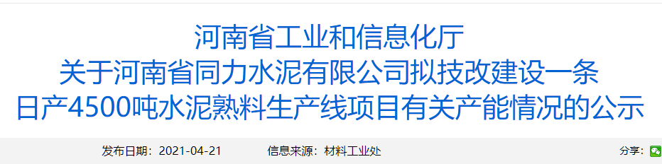 日前,河南省工業(yè)和信息化廳發(fā)布《關(guān)于河南省同力水泥有限公司擬技改建設(shè)一條日產(chǎn)4500噸水泥熟料生產(chǎn)線項(xiàng)目有關(guān)產(chǎn)能情況的公示》稱,河南省同力水泥有限公司擬通過(guò)通過(guò)“拆二合一”建設(shè)一條日產(chǎn)4500噸水泥熟料生產(chǎn)線。