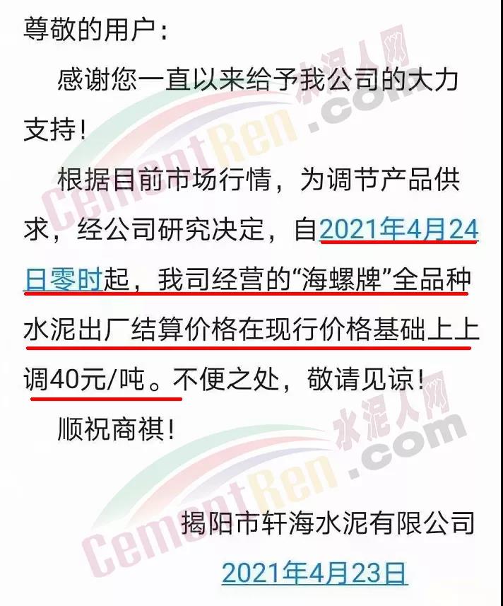 揭陽市軒海水泥有限公司通知自4月24日零時(shí)起,公司經(jīng)營(yíng)的“海螺牌”全品種水泥出廠結(jié)算價(jià)格在現(xiàn)行價(jià)格基礎(chǔ)上上調(diào)40元/噸。