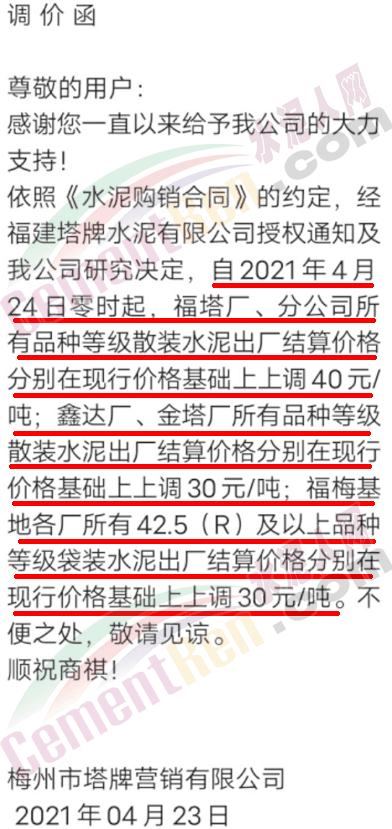 梅州市塔牌營(yíng)銷有限公司通知,依照《水泥購銷合同》的約定,經(jīng)福建塔牌水泥有限公司授權(quán)通知及我公司研究決定,自4月24日零時(shí)起,福塔廠、分公司所有品種等級(jí)散裝水泥出廠結(jié)算價(jià)格分別在現(xiàn)行價(jià)格基礎(chǔ)上上調(diào)40元/噸;鑫達(dá)廠、金塔廠所有品種等級(jí)散裝水泥出廠結(jié)算價(jià)格分別在現(xiàn)行價(jià)格基礎(chǔ)上上調(diào)30元/噸;福梅基地各廠所有42.5(R)及以上品種等級(jí)袋裝水泥出廠結(jié)算價(jià)格分別在現(xiàn)行價(jià)格基礎(chǔ)上上調(diào)30元/噸。