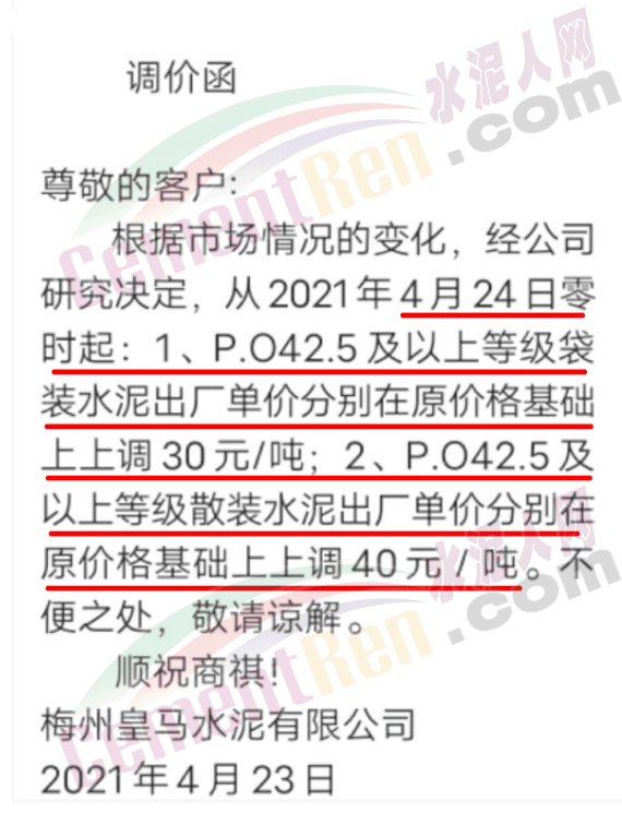 梅州皇馬水泥有限公司通知,從2021年4月24日零時(shí)起,P.O42.5及以上等級(jí)袋裝水泥出廠單價(jià)分別在原價(jià)格基礎(chǔ)上上調(diào)30元/噸;P.O42.5及以上等級(jí)散裝水泥出廠單價(jià)分別在原價(jià)格基礎(chǔ)上上調(diào)40元/噸。