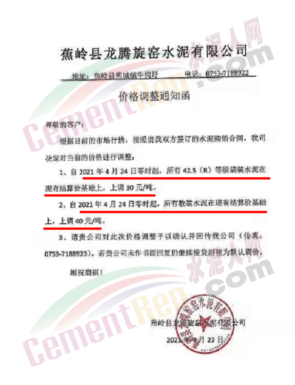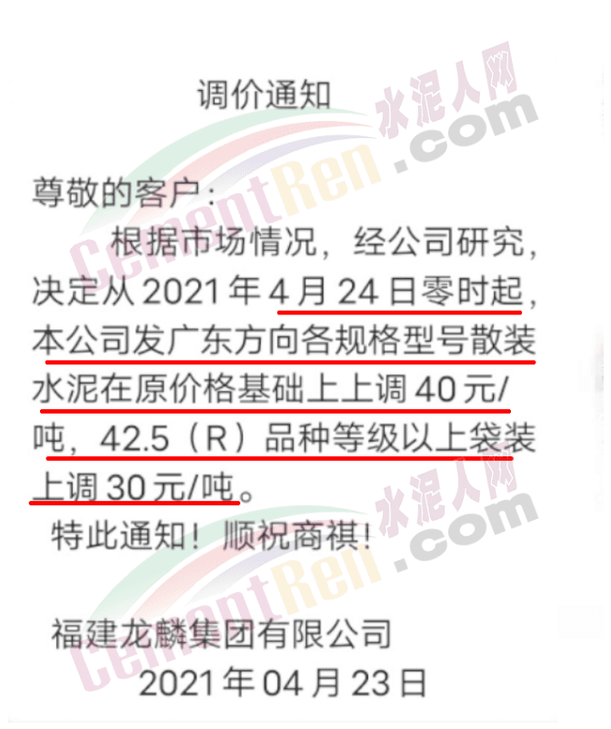 福建龍麟集團(tuán)有限公司通知從4月24日零時(shí)起,發(fā)廣東方向各規(guī)格型號(hào)散裝水泥在原價(jià)格基礎(chǔ)上上調(diào)40元/噸,42.5(R)品種等級(jí)以上袋裝上調(diào)30元/噸。