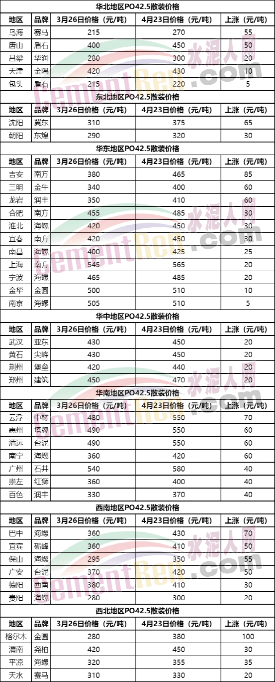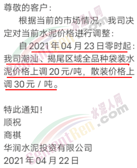 華潤(rùn)水泥投資有限公司通知自4月23日零時(shí)起,公司潮汕、揭尾區(qū)域全品種袋裝水泥價(jià)格上調(diào)20元/噸,散裝價(jià)格上調(diào)30元/噸。