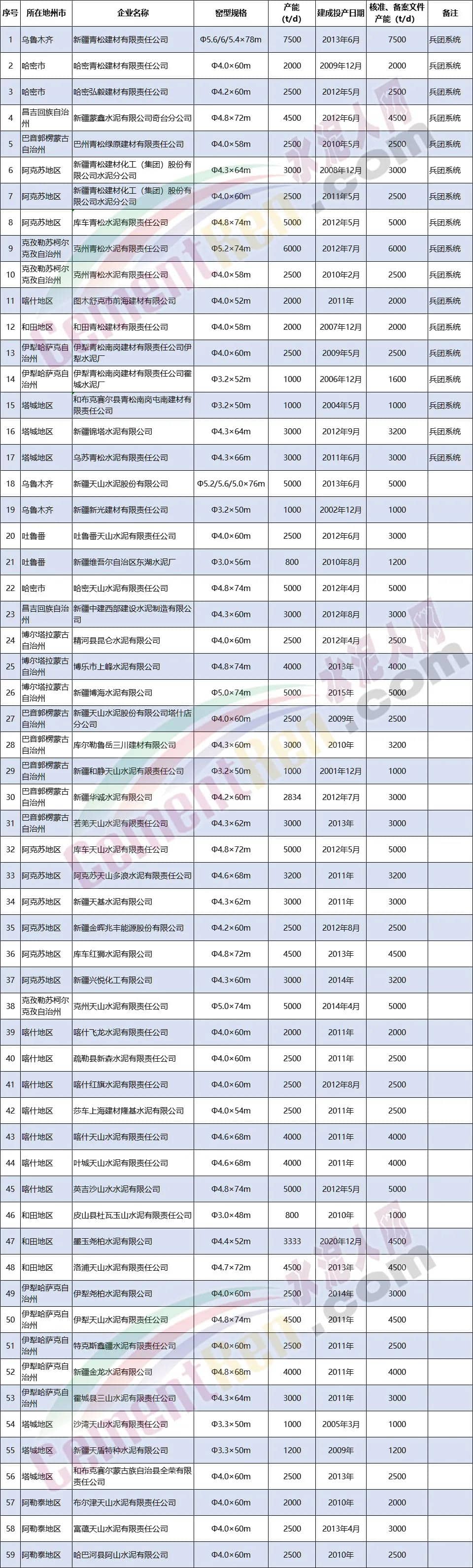 另外59條熟料生產(chǎn)線中包含兵團(tuán)系統(tǒng)17條熟料生產(chǎn)線,合計(jì)產(chǎn)能1599萬噸 。其余42條生產(chǎn)線,合計(jì)產(chǎn)能3915萬噸。