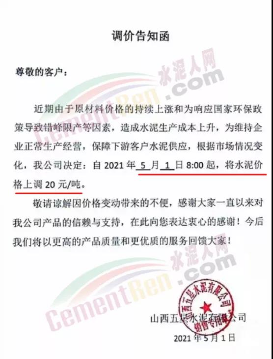 山西五星水泥有限公司發(fā)通知稱,近期由于原材料價(jià)格的持續(xù)上漲和為響應(yīng)國家環(huán)保政策導(dǎo)致錯(cuò)峰限產(chǎn)等因素,造成水泥生產(chǎn)成本上升,為維持企業(yè)正常生產(chǎn)經(jīng)營(yíng),保障下游客戶水泥供應(yīng),根據(jù)市場(chǎng)情況變化,公司決定自2021年5月1日8時(shí)起,將水泥價(jià)格上調(diào)20元/噸。