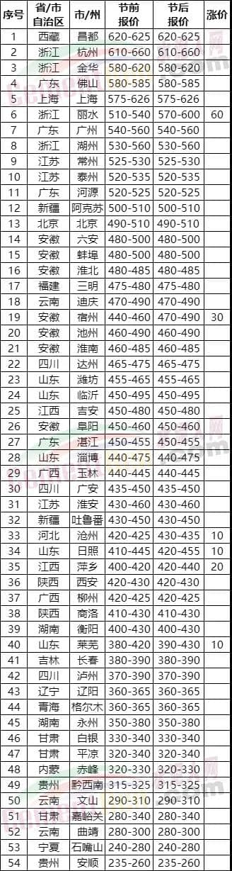 節(jié)前節(jié)后各區(qū)域報(bào)價(jià)對(duì)比