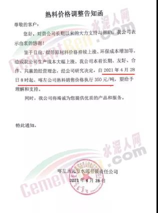 遼寧山水旗下喀左叢元號(hào)水泥有限責(zé)任公司發(fā)熟料價(jià)格調(diào)整告知函稱,鑒于目前原燃材料價(jià)格持續(xù)上漲、環(huán)保成本增加等,造成公司生產(chǎn)成本大幅上漲。經(jīng)研究決定自2021年4月28日8時(shí)起,喀左公司熟料銷售價(jià)格執(zhí)行350 元/噸。
