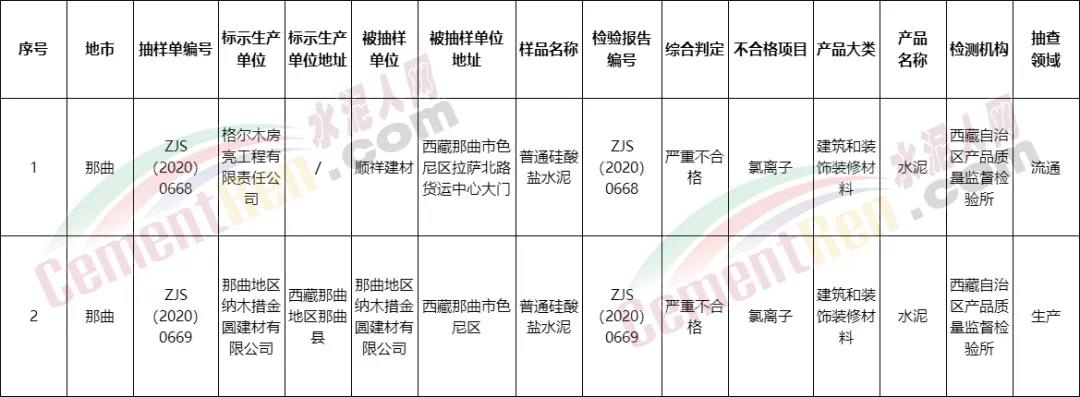 日前,西藏自治區(qū)市場監(jiān)督管理局發(fā)布2020年產(chǎn)品質(zhì)量監(jiān)督抽查不合格產(chǎn)品(第一批)公告,其中2020年產(chǎn)品質(zhì)量自治區(qū)監(jiān)督抽查綜合判定為嚴重不合格名單中包括兩家水泥企業(yè)。兩家企業(yè)標示生產(chǎn)單位分別為格爾木房亮工程有限責任公司和那曲地區(qū)納木措金圓建材有限公司。不合格項目均為氯離子,其中標稱為格爾木房亮工程有限責任公司的產(chǎn)品抽查領(lǐng)域為流通領(lǐng)域順祥建材,標示為那曲地區(qū)納木措金圓建材有限公司的產(chǎn)品來自于生產(chǎn)領(lǐng)域。