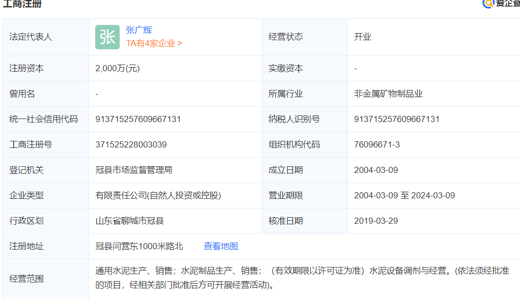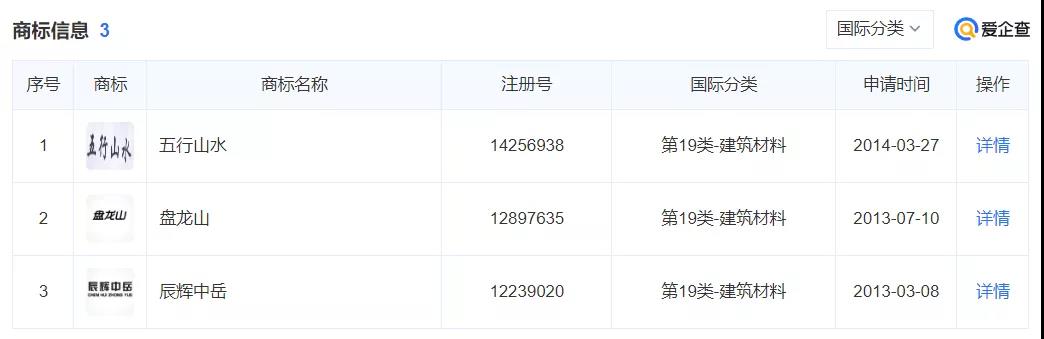 據(jù)查詢“五行山水”商標申請人為冠縣辰輝新型建材有限公司(生產(chǎn)許可證編號XK08-001-05728),企業(yè)同時擁有“五行山水,盤龍山、辰輝中岳”三個注冊商標,且全部為建材材料類商標。