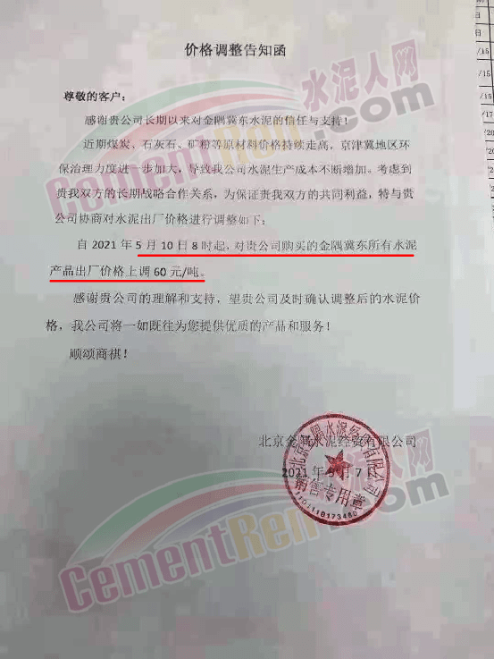 河北承大環(huán)保科技有限公司通知:由于京津冀地區(qū)環(huán)保治理力度加大,生產(chǎn)企業(yè)對(duì)政府錯(cuò)峰停產(chǎn)政策嚴(yán)格落實(shí),加之近期能源、電力及生產(chǎn)水泥的礦渣、礦粉等大幅漲價(jià);致使公司水泥生產(chǎn)成本大幅提高,公司根據(jù)水泥生產(chǎn)成本增加和市場(chǎng)情況,經(jīng)研究決定,自2021年5月8日早7時(shí)起調(diào)整所有產(chǎn)品的銷售價(jià)格,調(diào)整幅度為在原價(jià)基礎(chǔ)上上調(diào)50元/噸。4月1日也曾上調(diào)50元/噸,兩次累計(jì)上調(diào)100元/噸。
