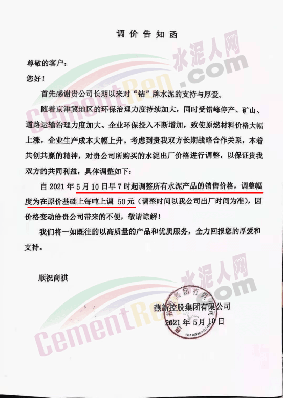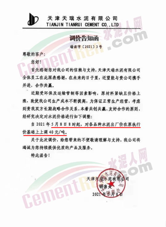 天津天瑞水泥有限公司通知,近期受環(huán)保及運(yùn)輸管制等因素影響,原材料緊缺且價(jià)格上漲,致使公司生產(chǎn)成本不斷提高,為保證正常生產(chǎn)經(jīng)營,經(jīng)研究決定自2021年5月8日8時(shí)起,對(duì)各品種水泥出廠價(jià)在原執(zhí)行價(jià)基礎(chǔ)上上調(diào) 40元/噸。