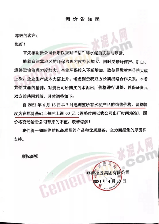 燕新控股集團(tuán)有限公司通知,隨著京津冀地區(qū)的環(huán)保治理力度持續(xù)加大,同時(shí)受錯(cuò)峰停產(chǎn)、礦山、道路運(yùn)輸治理力度加大,企業(yè)環(huán)保投入不斷增加,致使原燃材料價(jià)格大幅上漲,企業(yè)生產(chǎn)成本大幅上升。自2021年5月10日早7時(shí)起調(diào)整所有水泥產(chǎn)品的銷售價(jià)格,調(diào)整幅度為在原價(jià)基礎(chǔ)上上調(diào)50元/噸。4月16日曾上調(diào)60元/噸,兩次累計(jì)上調(diào)110元/噸。
