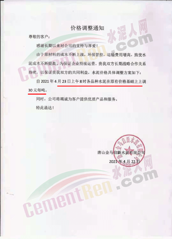 唐山金馬啟新水泥有限公司通知由于原材料的成本不斷上漲,環(huán)保管控,運(yùn)輸費(fèi)用增高,致使水泥成本不斷提高。自2021年5月10日上午8時(shí)各品種水泥在原有價(jià)格基礎(chǔ)上上調(diào)50元/噸。4月30日曾上調(diào)30元/噸,兩次累計(jì)上調(diào)80元/噸。
