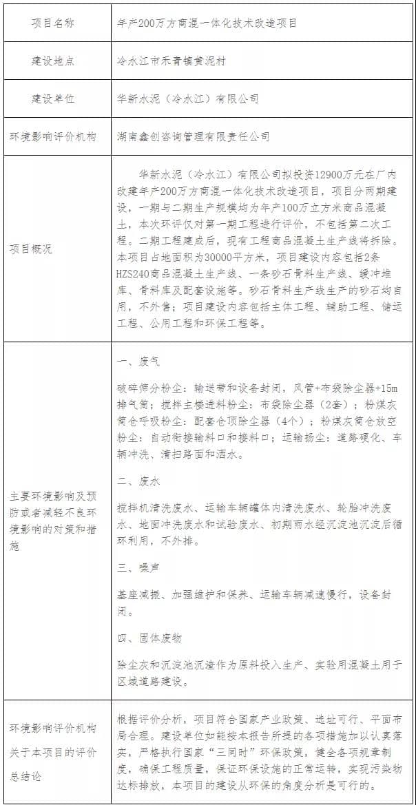 近日,華新水泥(冷水江)有限公司年產200萬方商混一體化技術改造項目境影響報告表擬審批公示。從公示得知,華新水泥(冷水江)有限公司擬投資12900萬元在廠內改建年產200萬方商混一體化技術改造項目,項目分兩期建設,一期與二期生產規(guī)模均為年產100萬立方米商品混凝土,本次環(huán)評僅對第一期工程進行評價,不包括第二次工程。