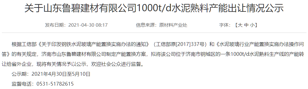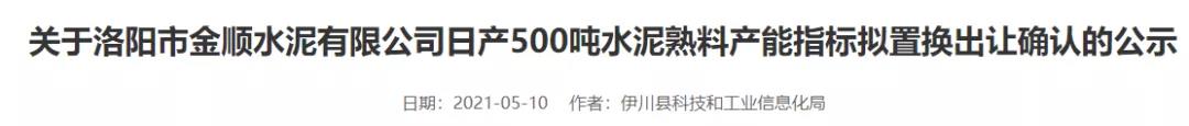 日前,河南省洛陽市伊川縣人民政府發(fā)布《關(guān)于洛陽市金順?biāo)嘤邢薰救债a(chǎn)500噸水泥熟料產(chǎn)能指標(biāo)擬置換出讓確認(rèn)的公示》稱,根據(jù)相關(guān)文件規(guī)定,現(xiàn)將關(guān)閉出讓的確認(rèn)產(chǎn)能有關(guān)情況進(jìn)行公示,具體公示如下:
