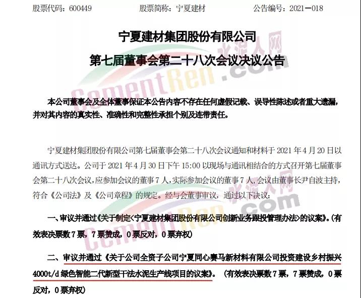 寧夏建材近日公布公司第七屆董事會第二十八次會議決議,審議并通過關(guān)于公司全資子公司寧夏同心賽馬新材料有限公司投資建設(shè)鄉(xiāng)村振興4000t/d綠色智能二代新型干法水泥生產(chǎn)線項(xiàng)目的議案。