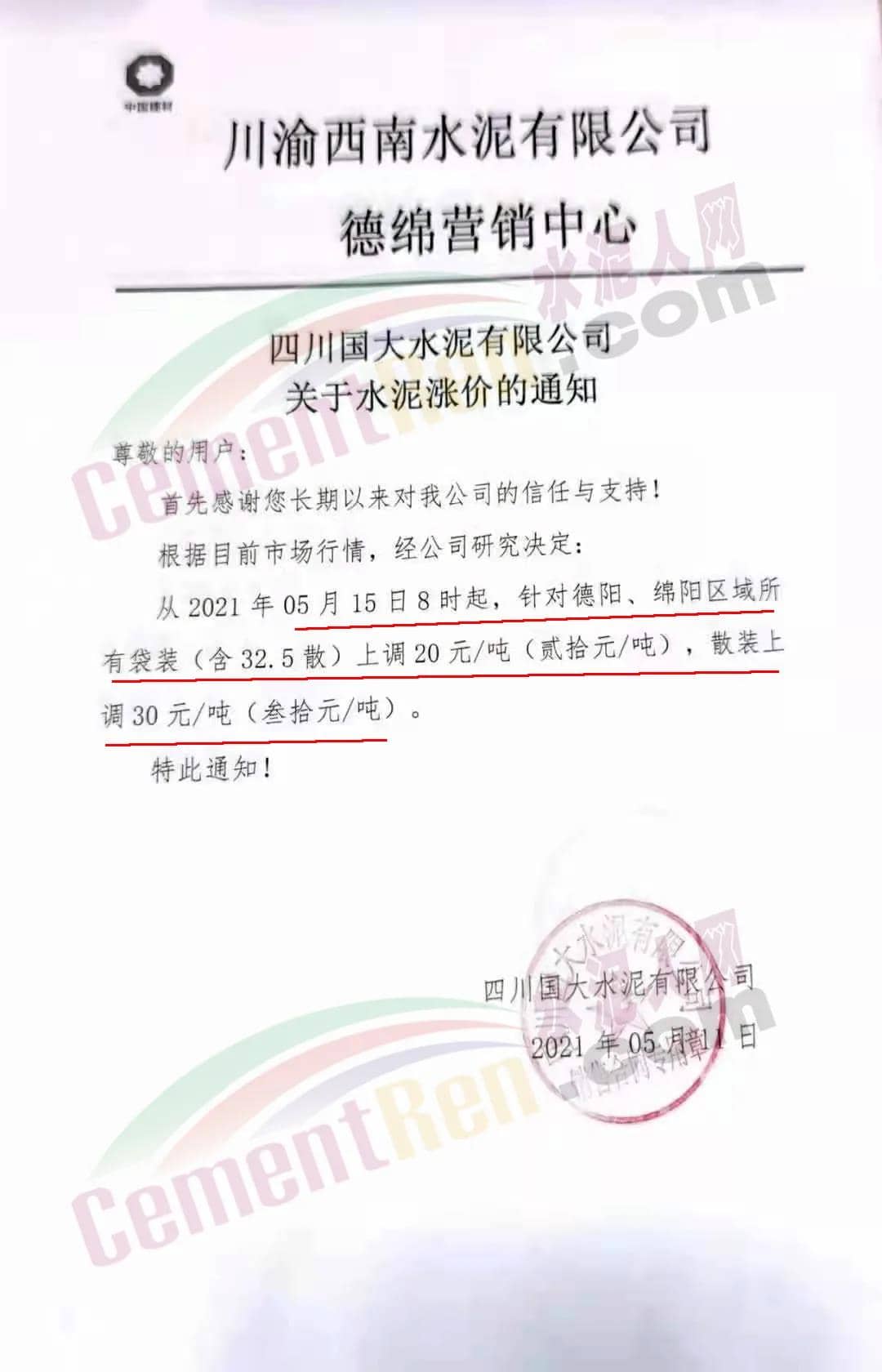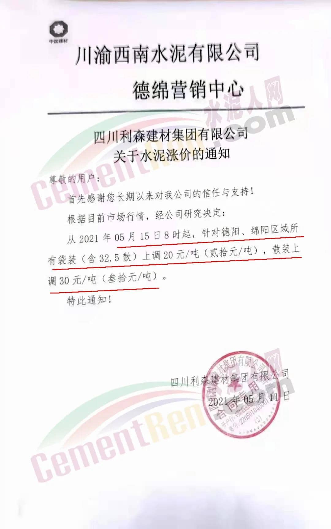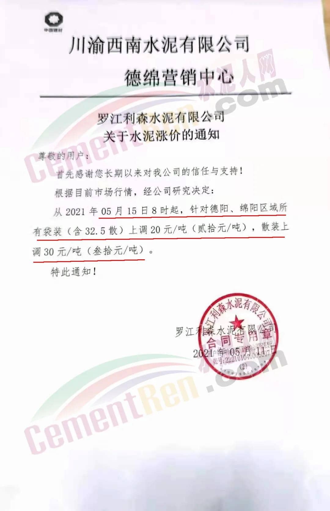 水泥人網(wǎng)通訊員消息 ,5月11日川渝西南水泥有限公司德綿營銷中心①羅江利森水泥有限公司、②四川省女媧建材有限公司、③四川省棉竹澳東水泥有限責(zé)任公司、④四川利森建材集團(tuán)有限公司、⑤四川國大水泥有限公司、⑥北川中聯(lián)水泥有限公司等六家企業(yè)集體發(fā)調(diào)價(jià)通知稱,根據(jù)目前市場行情,經(jīng)公司研究決定∶從 2021 年 5 月15 日 8 時(shí)起,針對(duì)德陽、綿陽區(qū)域所有袋裝(含 32.5散)上調(diào) 20元/噸(貳拾元/噸),散裝上調(diào) 30 元/噸(叁拾元/噸)。
