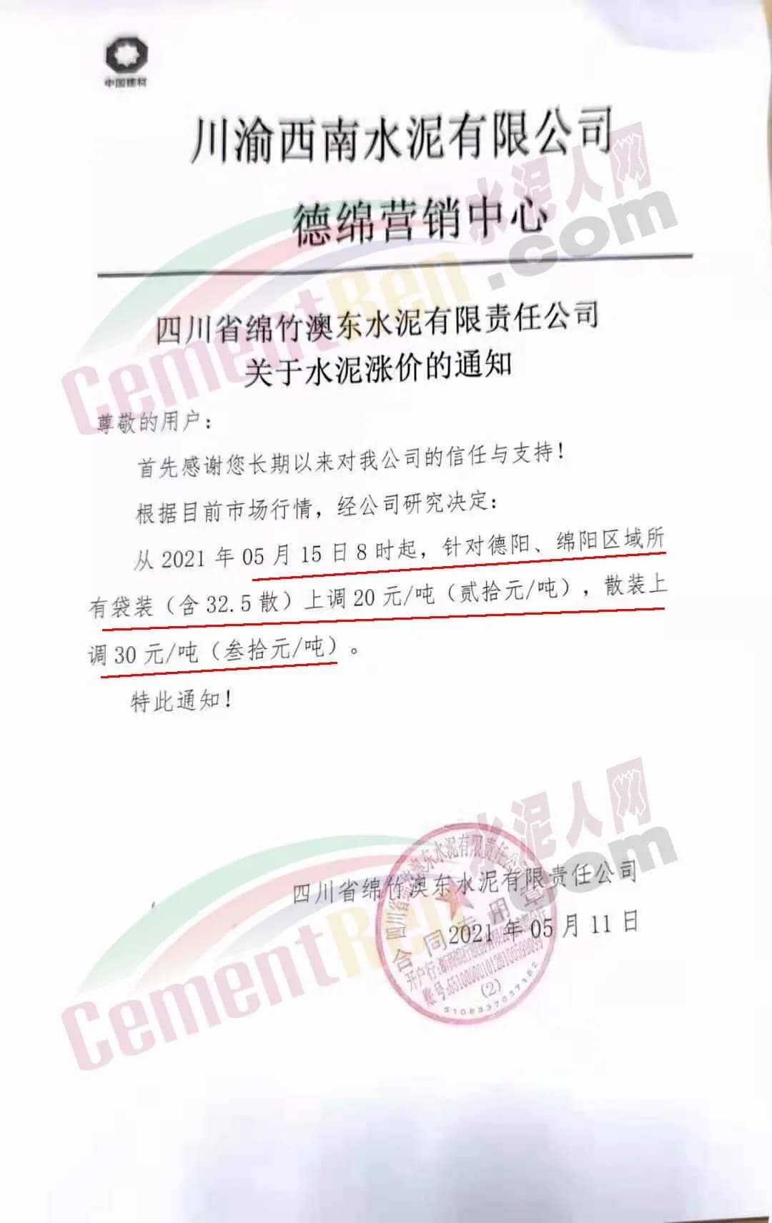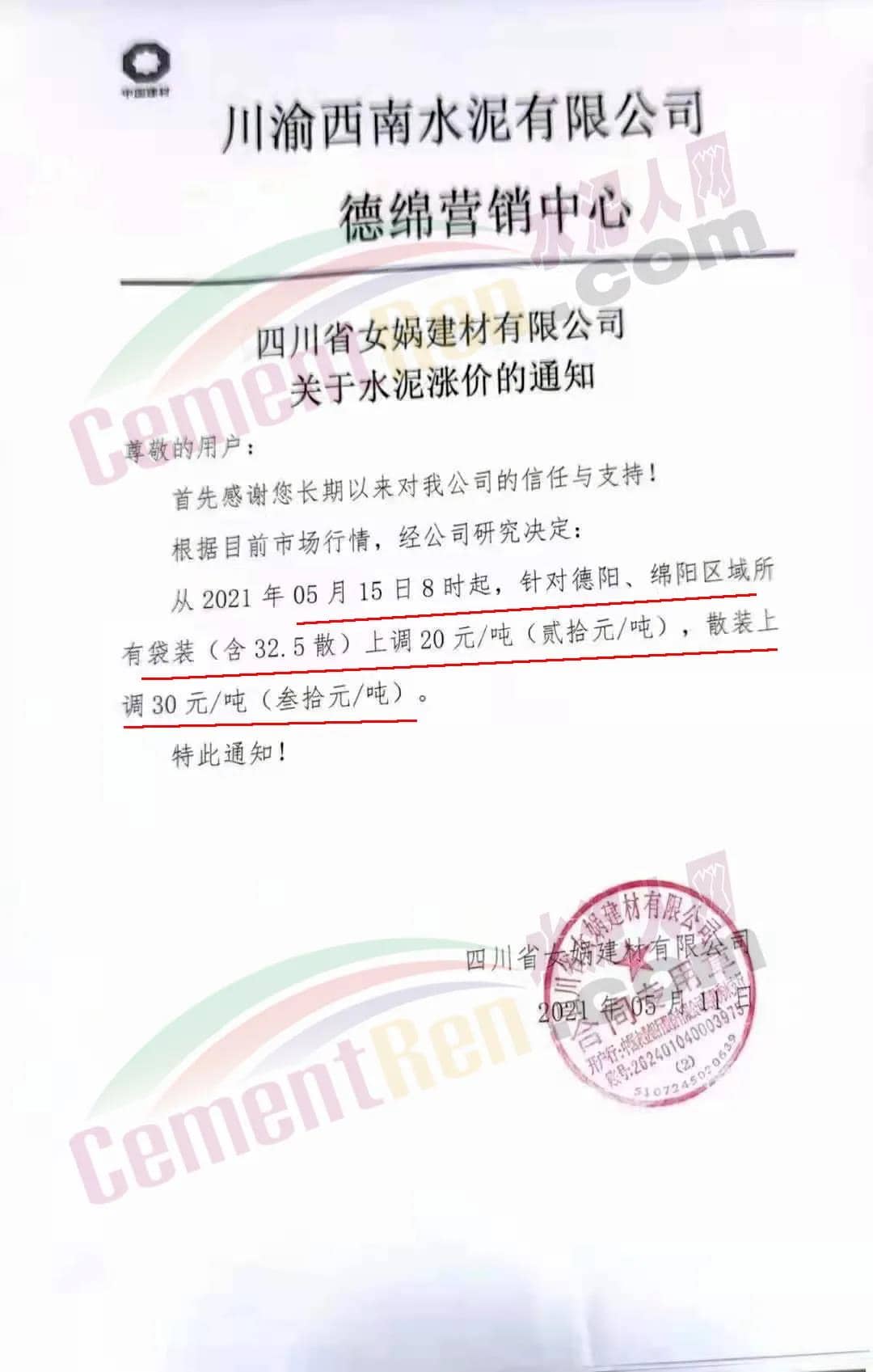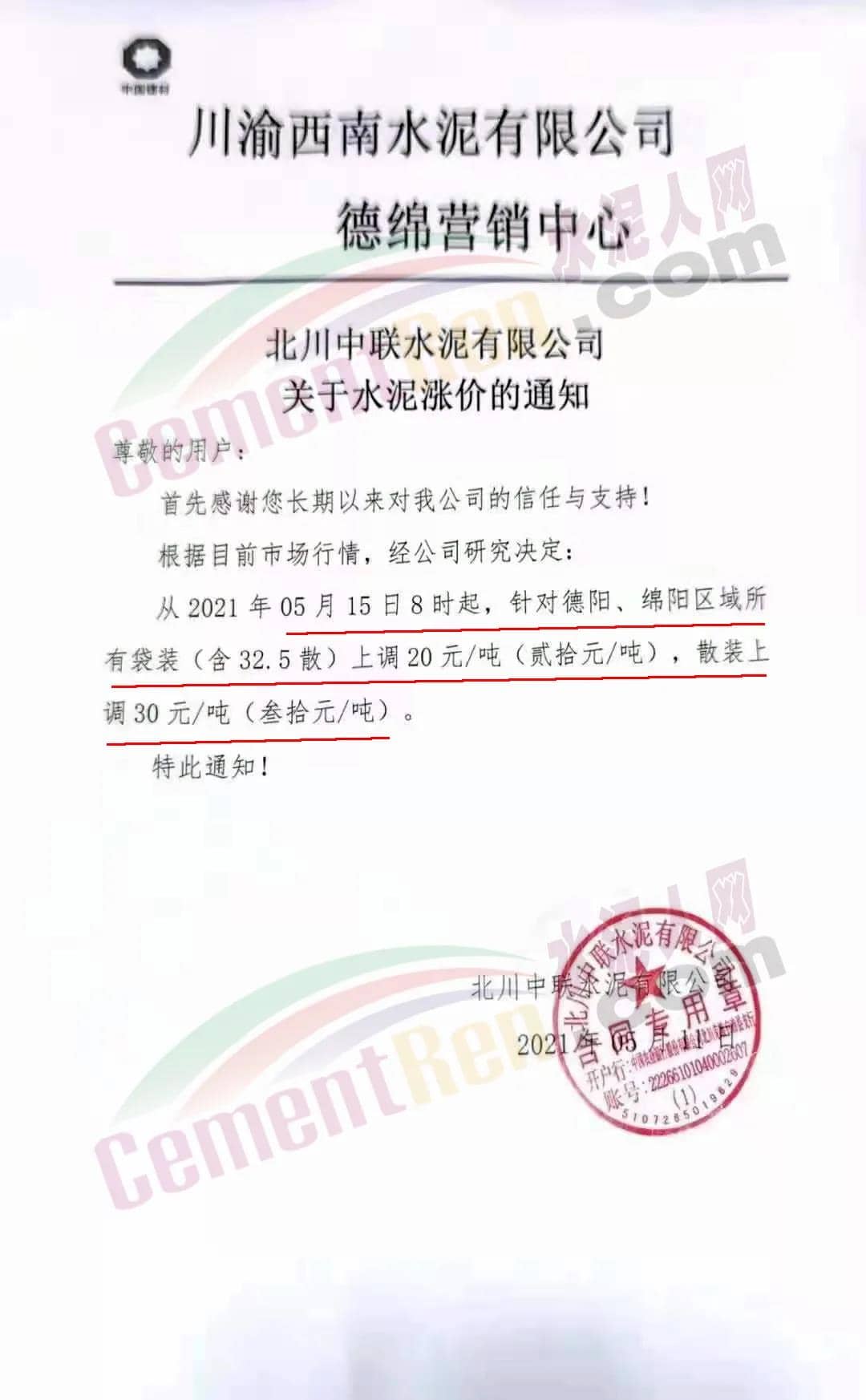 水泥人網(wǎng)通訊員消息 ,5月11日川渝西南水泥有限公司德綿營銷中心①羅江利森水泥有限公司、②四川省女媧建材有限公司、③四川省棉竹澳東水泥有限責(zé)任公司、④四川利森建材集團(tuán)有限公司、⑤四川國大水泥有限公司、⑥北川中聯(lián)水泥有限公司等六家企業(yè)集體發(fā)調(diào)價(jià)通知稱,根據(jù)目前市場行情,經(jīng)公司研究決定∶從 2021 年 5 月15 日 8 時(shí)起,針對(duì)德陽、綿陽區(qū)域所有袋裝(含 32.5散)上調(diào) 20元/噸(貳拾元/噸),散裝上調(diào) 30 元/噸(叁拾元/噸)。