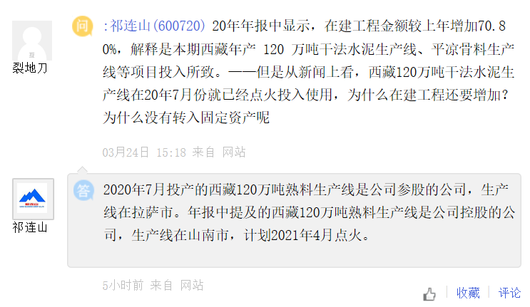 據(jù)查詢,早在2021年3月24日,就有投資者在上證e互動向上市公司祁連山(600720)提問,“2020年年報中顯示,在建工程金額較上年增加70.80%,解釋是本期西藏年產(chǎn)120萬噸干法水泥生產(chǎn)線、平?jīng)龉橇仙a(chǎn)線等項目投入所致。但是從新聞上看,西藏120萬噸干法水泥生產(chǎn)線在20年7月份就已經(jīng)點火投入使用,為什么在建工程還要增加?為什么沒有轉(zhuǎn)入固定資產(chǎn)呢?”