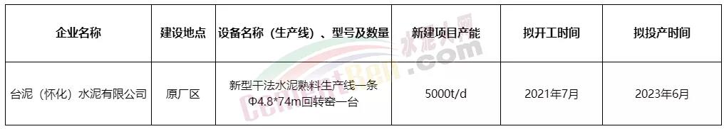 5月12日湖南省工信廳發(fā)布《關(guān)于臺泥(懷化)水泥有限公司日產(chǎn)5000噸新型干法水泥熟料回轉(zhuǎn)窯生產(chǎn)線技術(shù)升級改造項目有關(guān)情況的公示》稱,臺泥(懷化)水泥有限公司擬在原廠區(qū)內(nèi)實施智能化升級技術(shù)改造“合二為一”,建設(shè)一條日產(chǎn)5000噸新型干法水泥熟料回轉(zhuǎn)窯生產(chǎn)線,并將于2023年6月投產(chǎn)。