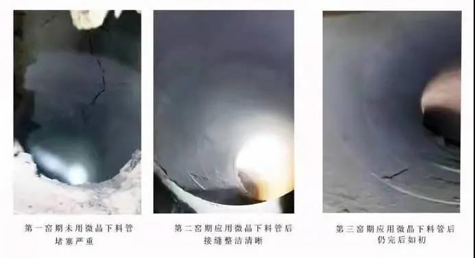 2020年10月份水泥窯檢修時發(fā)現(xiàn)整體微晶下料管內(nèi)沒有任何結(jié)皮,下料管的接口條紋清新可見,工程技術(shù)人員對此狀況驚嘆不已,當(dāng)場決定不做任何修正繼續(xù)使用。又經(jīng)過第二窯期的運(yùn)行至今年四月底,再次停窯后發(fā)現(xiàn)下料管仍完好如初,于是順利投入了第三個窯期的運(yùn)行。