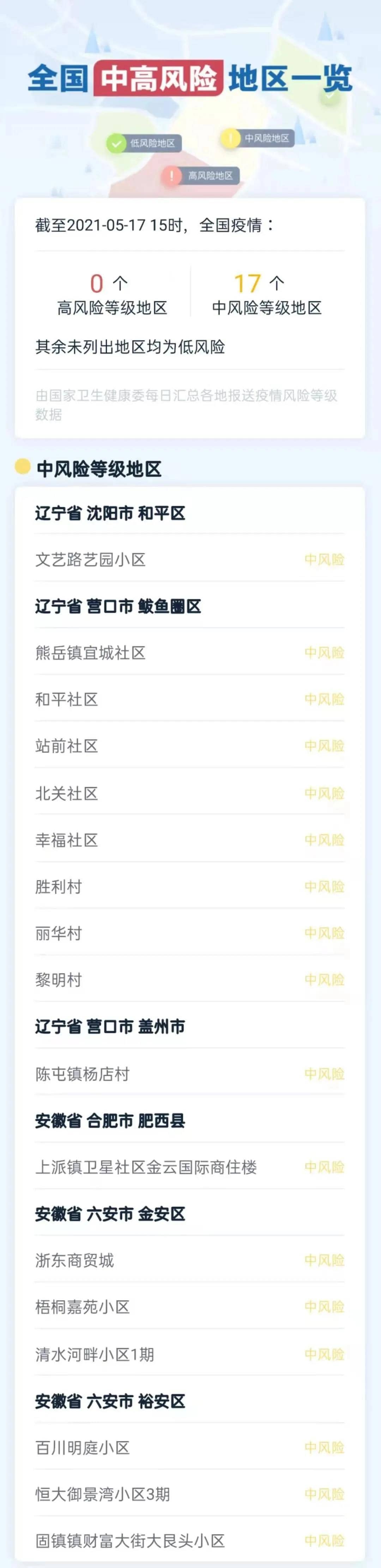 截止5月17日11時(shí),全國中風(fēng)險(xiǎn)地區(qū)已經(jīng)增至17個(gè),安徽省7個(gè),遼寧省10個(gè)。