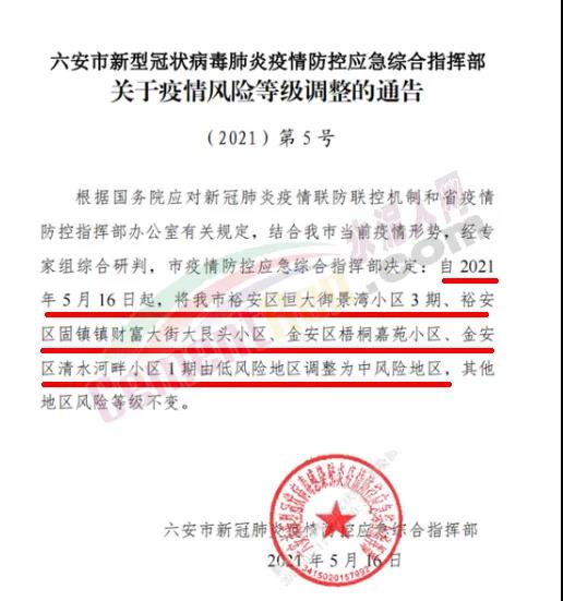 5月16日,安徽省六安市新型冠狀病毒肺炎疫情防控應(yīng)急綜合指揮部發(fā)布《關(guān)于疫情風(fēng)險(xiǎn)等級(jí)調(diào)整的通告》稱,根據(jù)國務(wù)院應(yīng)對(duì)新冠肺炎疫情聯(lián)防聯(lián)控機(jī)制和省疫情防控指揮部辦公室有關(guān)規(guī)定,結(jié)合六安市當(dāng)前疫情形勢,經(jīng)專家組綜合研判,市疫情防控應(yīng)急綜合指揮部決定∶自 2021年5月16日起,將六安市裕安區(qū)恒大御景灣小區(qū)3期、裕安區(qū)固鎮(zhèn)鎮(zhèn)財(cái)富大街大艮頭小區(qū)、金安區(qū)梧桐嘉苑小區(qū)、金安區(qū)清水河畔小區(qū)1期由低風(fēng)險(xiǎn)地區(qū)調(diào)整為中風(fēng)險(xiǎn)地區(qū),其他地區(qū)風(fēng)險(xiǎn)等級(jí)不變。