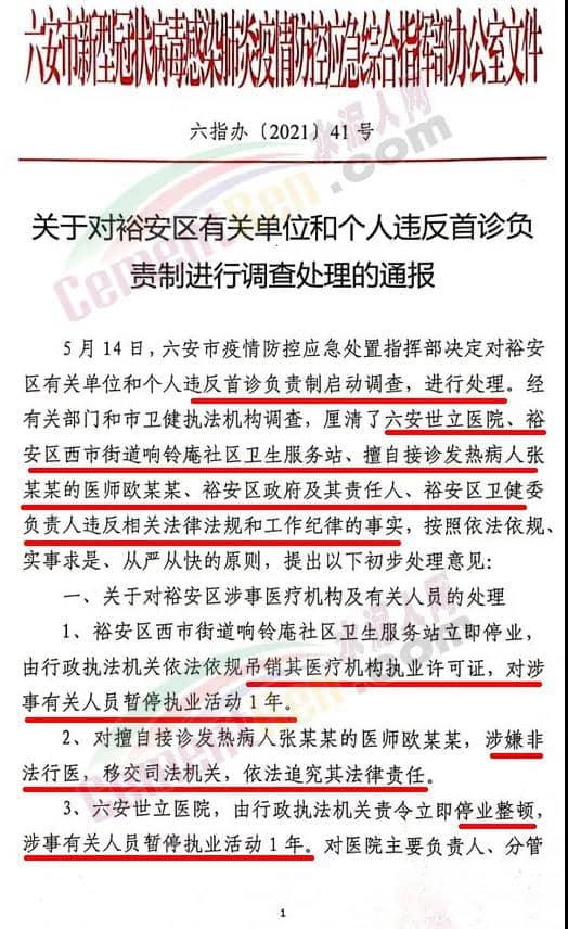 5月16日,安徽六安裕安區(qū)有關(guān)單位和個(gè)人因違反首診負(fù)責(zé)制,多人被問責(zé),其中包括:對(duì)擅自接診發(fā)熱病人張某某的醫(yī)師歐某某,涉嫌非法行醫(yī),移交司法機(jī)關(guān),依法追究其法律責(zé)任;責(zé)成裕安區(qū)對(duì)區(qū)衛(wèi)健委主要負(fù)責(zé)人、分管負(fù)責(zé)人,立即停職,接受進(jìn)一步調(diào)查處理等。