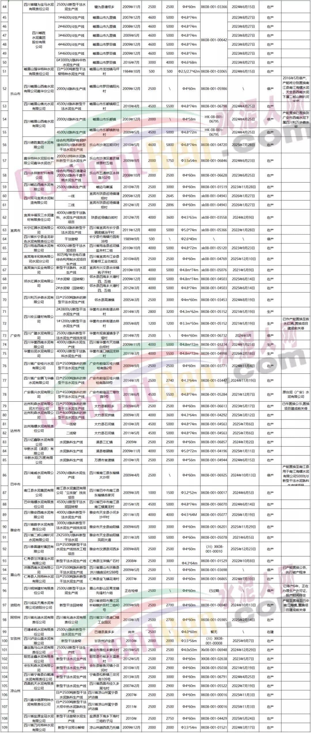 5月18日,四川省經(jīng)濟(jì)和信息化廳發(fā)布了《關(guān)于四川省水泥熟料和平板玻璃生產(chǎn)線清單的公示》,公示顯示,截止到2020年12月31日,四川省共有109條水泥熟料生產(chǎn)線,合計(jì)產(chǎn)能9921.93萬(wàn)噸,其中10條停產(chǎn),1條在建。