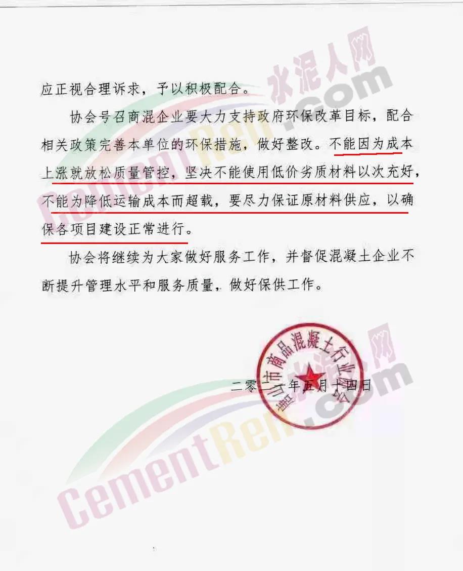 協(xié)會(huì)號(hào)召商混企業(yè)要大力支持政府環(huán)保改革目標(biāo),配合相關(guān)政策完善本單位的環(huán)保措施,做好整改。不能因?yàn)槌杀旧蠞q就放松質(zhì)量管控,堅(jiān)決不能使用低價(jià)劣質(zhì)材料以次充好,不能為降低運(yùn)輸成本而超載,要盡力保證原材料供應(yīng),以確保各項(xiàng)目建設(shè)正常進(jìn)行。