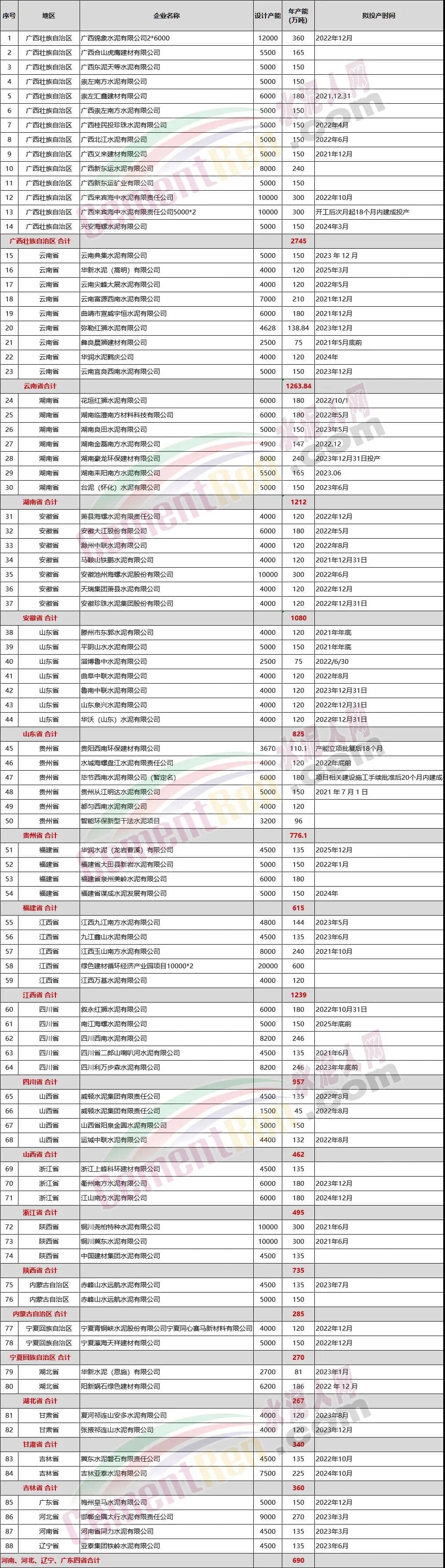 水泥人網(wǎng)注意到,上述88個(gè)項(xiàng)目,合計(jì)產(chǎn)能近1.5億噸。集中上線新建產(chǎn)能的區(qū)域多是市場(chǎng)競(jìng)爭(zhēng)相對(duì)較激烈的區(qū)域。以廣西壯族自治區(qū)為例,14個(gè)新建項(xiàng)目產(chǎn)能合計(jì)達(dá)2745萬(wàn)噸,擬投產(chǎn)時(shí)間多在2025年之前。涉及企業(yè)不僅包括海螺水泥、南方水泥、紅獅水泥也包括錦象水泥、虎鷹建材等,除廣西來(lái)賓海中水泥有限責(zé)任公司一條萬(wàn)噸線外,其余13個(gè)項(xiàng)目16條熟料生產(chǎn)線規(guī)模均在5000-8000t/d之間。