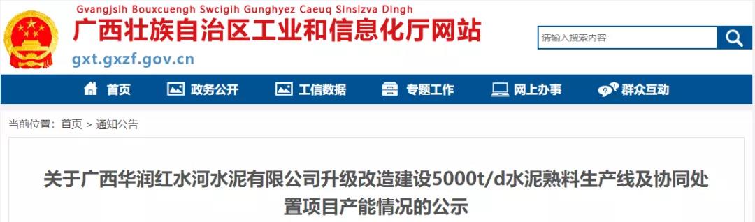 日前,廣西壯族自治區(qū)工業(yè)和信息化廳發(fā)布《關(guān)于廣西華潤紅水河水泥有限公司升級改造建設5000t/d水泥熟料生產(chǎn)線及協(xié)同處置項目產(chǎn)能情況的公示》稱,按照相關(guān)通知要求,將廣西華潤紅水河水泥有限公司升級改造建設5000t/d水泥熟料生產(chǎn)線及協(xié)同處置項目產(chǎn)能情況進行公示,具體公式如下: