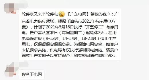 汕頭市通知稱,廣東省電力供應(yīng)緊張,根據(jù)《汕頭市2021年有序用電方案》,計(jì)劃于2021年5月18日?qǐng)?zhí)行“開五停二”有序用電。用戶需從基準(zhǔn)日(每周星期二)起輪休2天,在用電高峰時(shí)段(9-12時(shí)、14-17時(shí)、18-21時(shí))停止生產(chǎn)用電,僅保留保安保溫負(fù)荷。