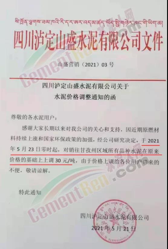四川瀘定山盛水泥有限公司通知,因近期原燃材料持續(xù)上漲和國家環(huán)保政策的加強(qiáng),經(jīng)公司研究決定,于 2021年5月23日零時(shí)起,對(duì)銷往甘孜州區(qū)域所有品種水泥在原來價(jià)格的基礎(chǔ)上上調(diào) 30 元/噸。