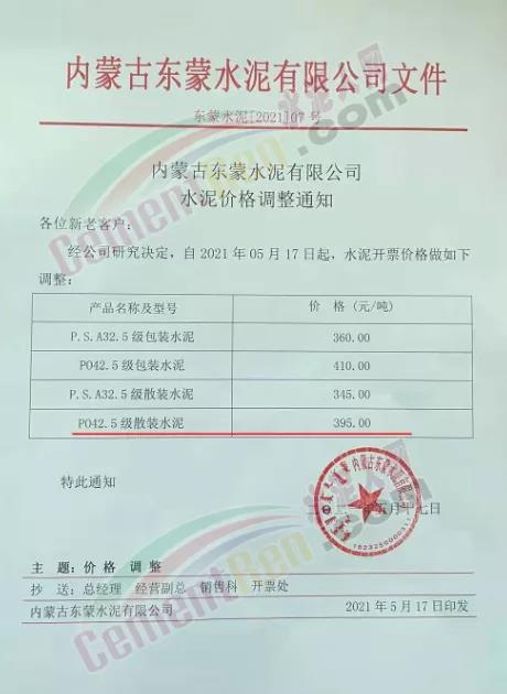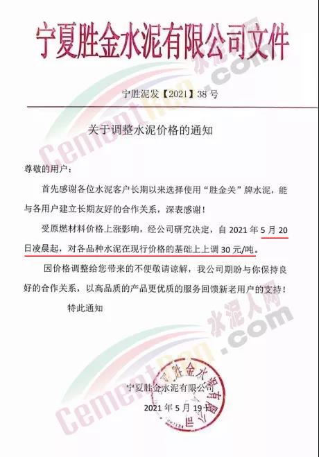 阿拉善左旗瀛海建材有限責(zé)任公司、寧夏瀛海天琛建材通知,因近期大宗原燃材料持續(xù)上漲,導(dǎo)致公司生產(chǎn)成本大幅攀升,經(jīng)公司研究決定,在5月15日上調(diào)水泥和熟料價(jià)格30元/噸、20元/噸基礎(chǔ)上再次上調(diào)50元/噸、20元/噸。兩次累計(jì)水泥上調(diào)80元/噸,熟料上調(diào)40元/噸。